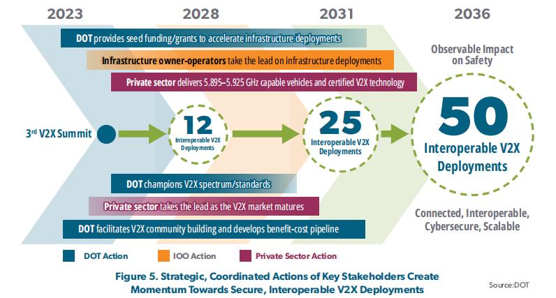 美国交通部发布C-V2X车联网部署计划,旨在提升道路安全,降低交通伤亡,全国范围内加速部署。短期目标实现高速公路覆盖率达到20%,路口覆盖率达到25%,中期目标达到50%,长期目标实现100%覆盖。