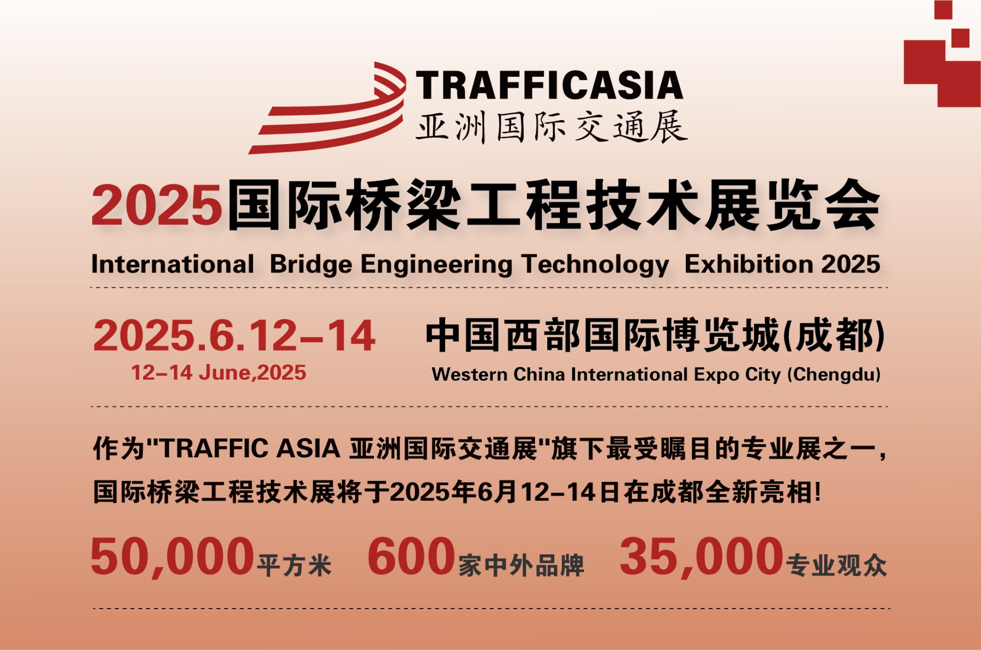 作为"TRAFFIC ASIA 亚洲国际交通展暨交通工程建设供应链展"旗下最受瞩目的专业展之一,2025国际桥梁工程技术展览会将于2025年6月12-14日在中国(成都)西部国际博览城隆重召开,展会以“新质领航·数字赋能”为主题,展览面积15000平方米,预计200+参展商,展会致力于全面展示桥梁建设养护领域的新技术、新工艺、新材料、新设备,涵盖科技创新成果、规划设计、桥梁材料与结构、桥梁建设与养护、桥梁检测与监测、智能建造、建设养护材料等桥梁建设领域的优秀企业、前沿技术与优质解决方案。为促进行业合作共融、整合升级、提升服务价值链搭建展示交流的行业平台。 本届展会的成功召开定将为我国桥梁建设提供有利技术交流、产品展示的平台,活动期间组委会还将重点邀请各省、市、自治区桥梁勘察设计、研究规划、建设施工、监理评估以及运营管理等单位参展、参观、参会。